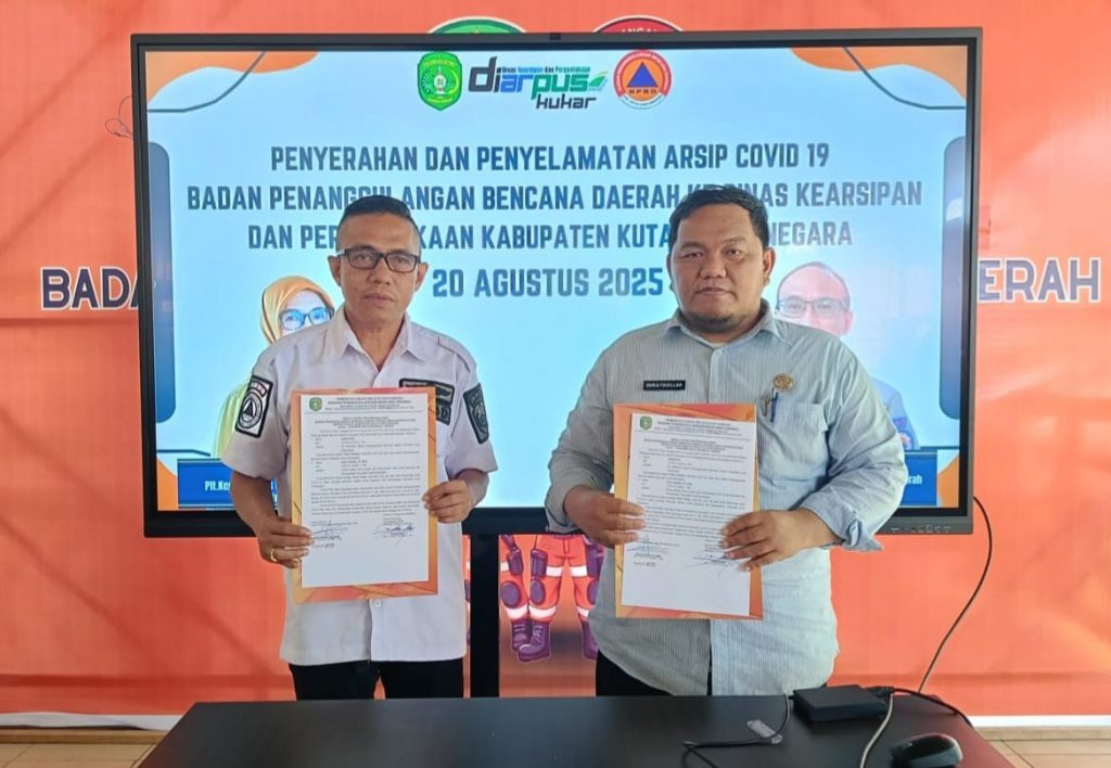 TENGGARONG – Badan Penanggulangan Bencana Daerah (BPBD) Kabupaten Kutai Kartanegara menyerahkan arsip penanganan Covid-19 kepada Dinas Kearsipan dan Perpustakaan (Disarpus) Kukar pada Rabu, 20 Agustus